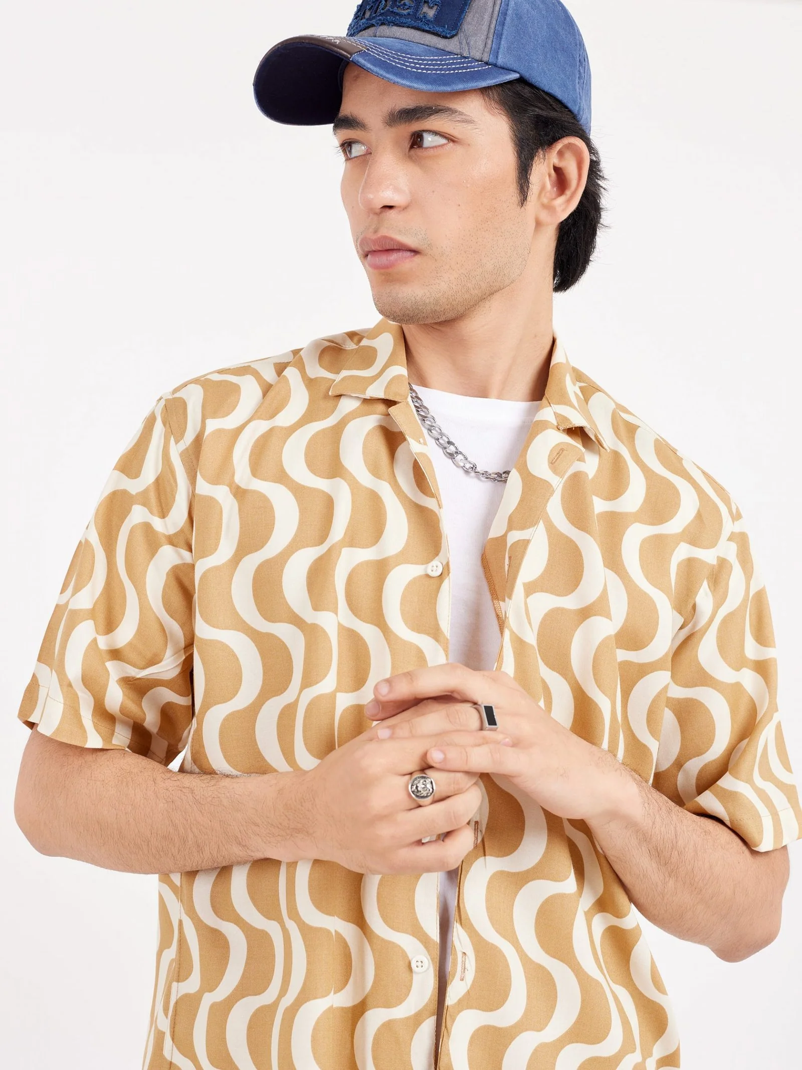 Relaxed fit patterned printed shirt in soft rayon, has a spread collar, half sleeves, straight-cut hem with a button placket.