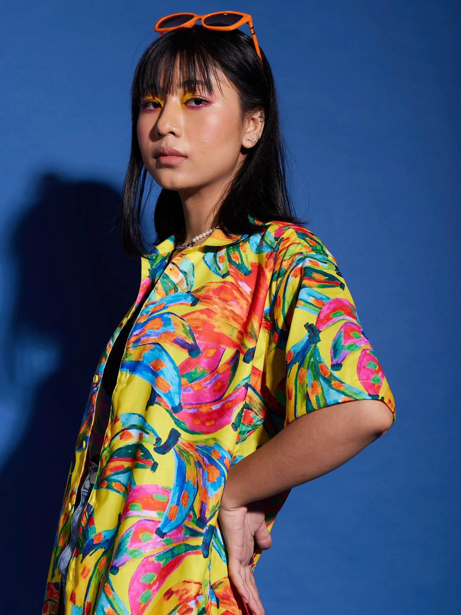 Relaxed fit banana printed shirt in soft modal, has a spread collar, half sleeves, straight-cut hem with a button placket.