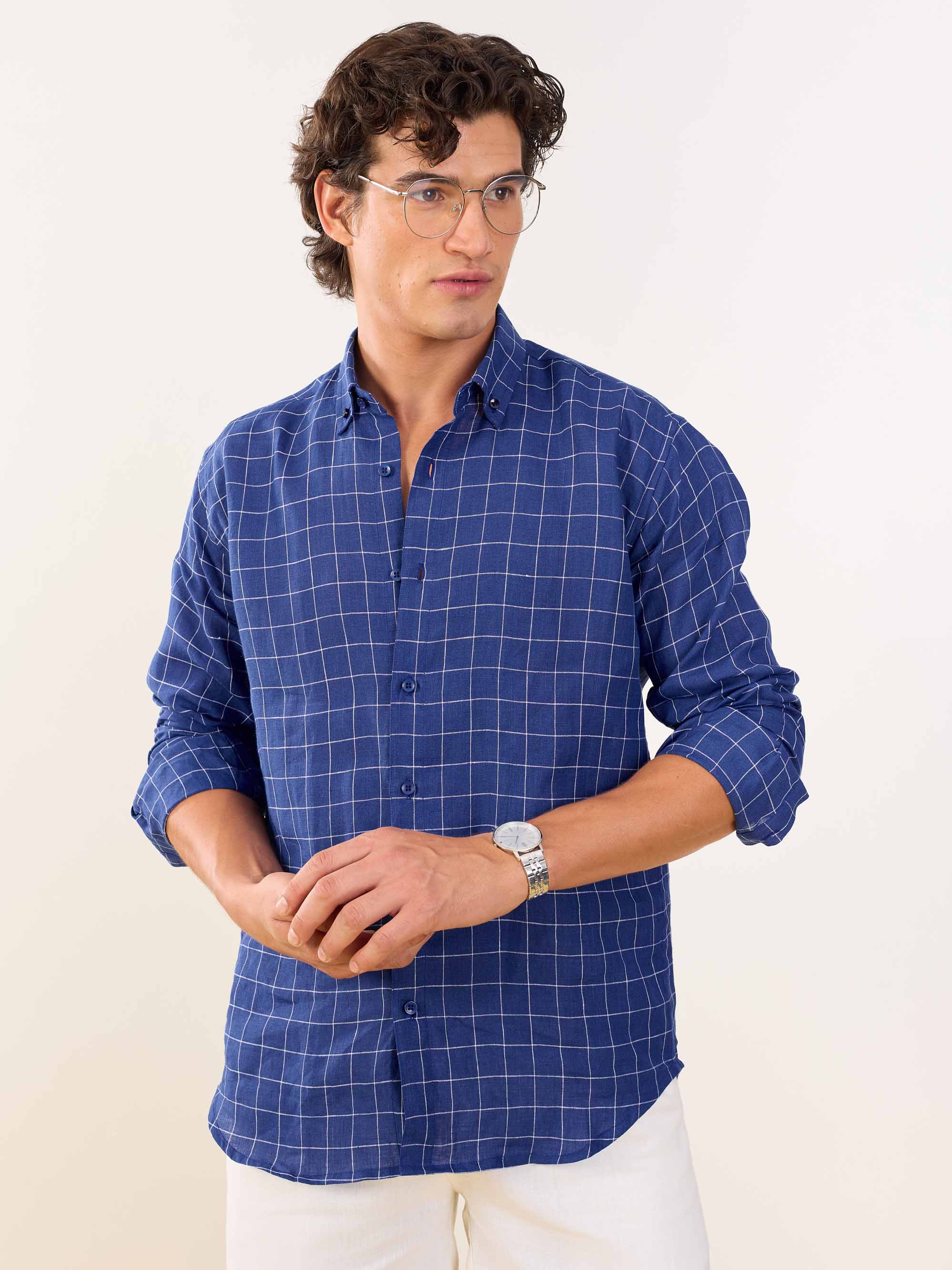 Royal Blue Checked Irish Linen Shirt