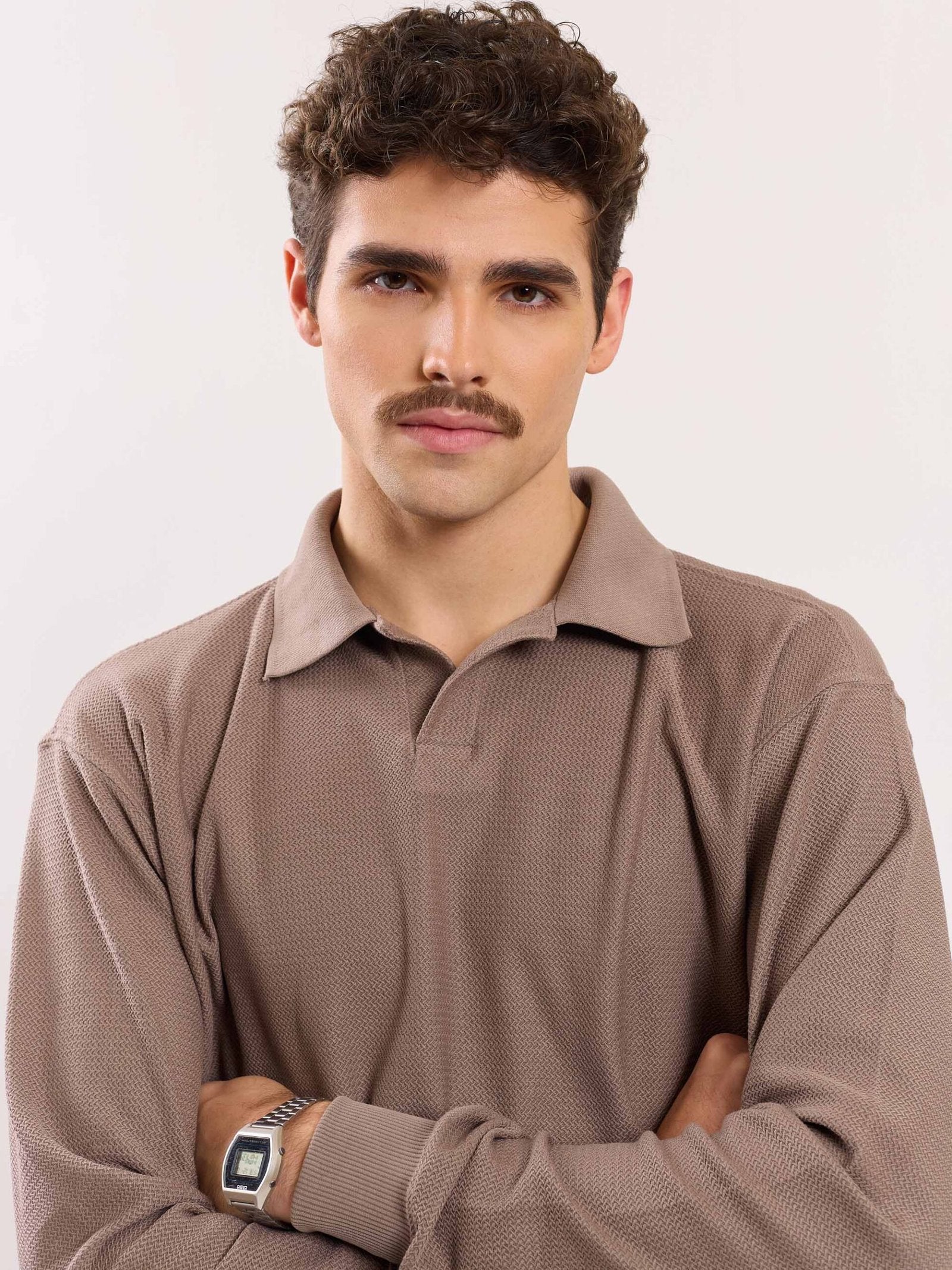 -70%Taupe Jacquard Knit Polo T-shirt—